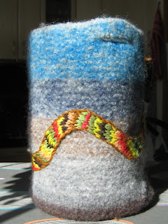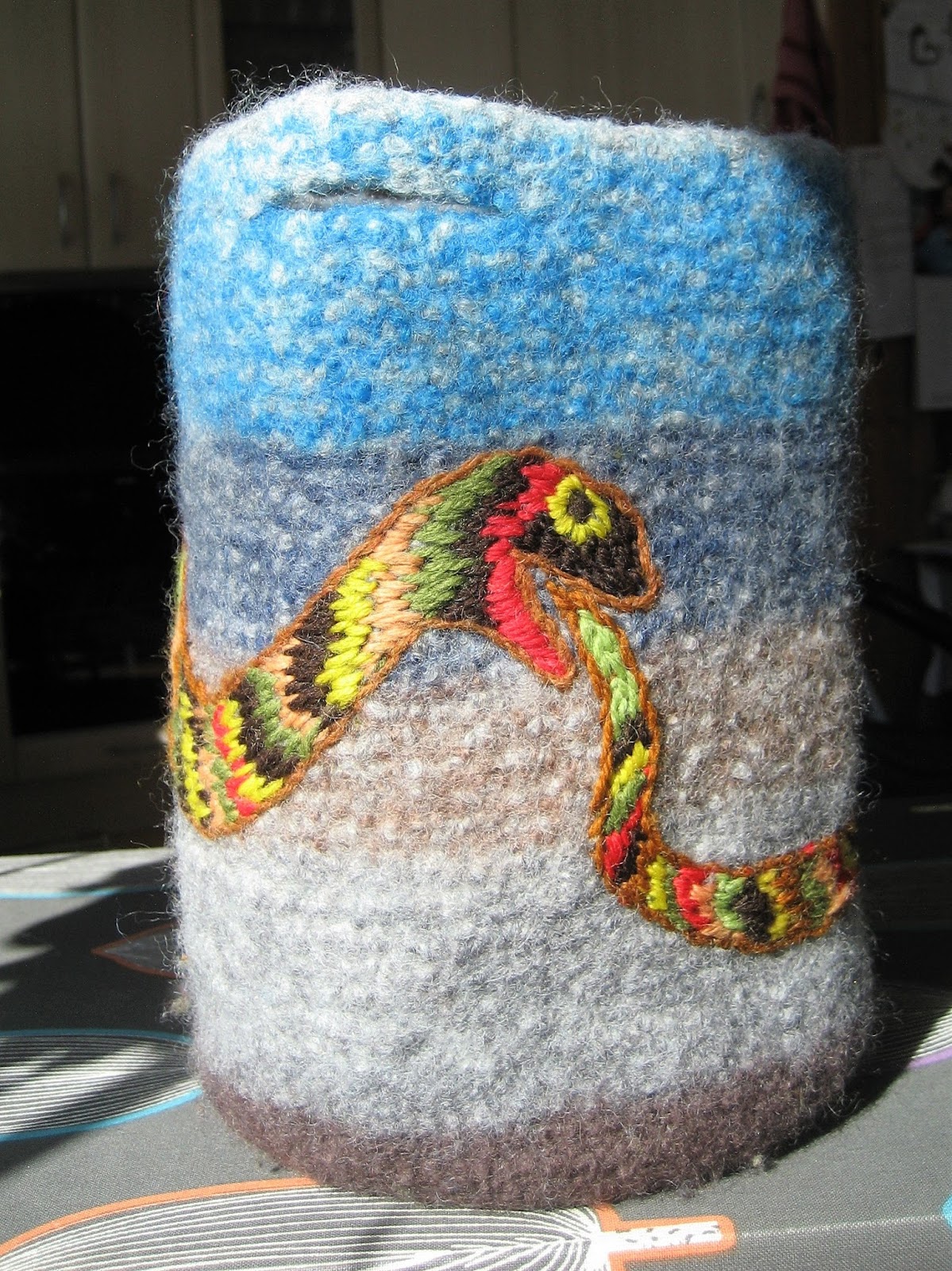 Flott veske du har strikket og tovet, og broderiet er imponerende. Det tok ganske sikkert mye tid med mange farger, et skikkelig håndarbeid. håper det blir flere blogginnlegg fra deg når det nå våres i bakkene.